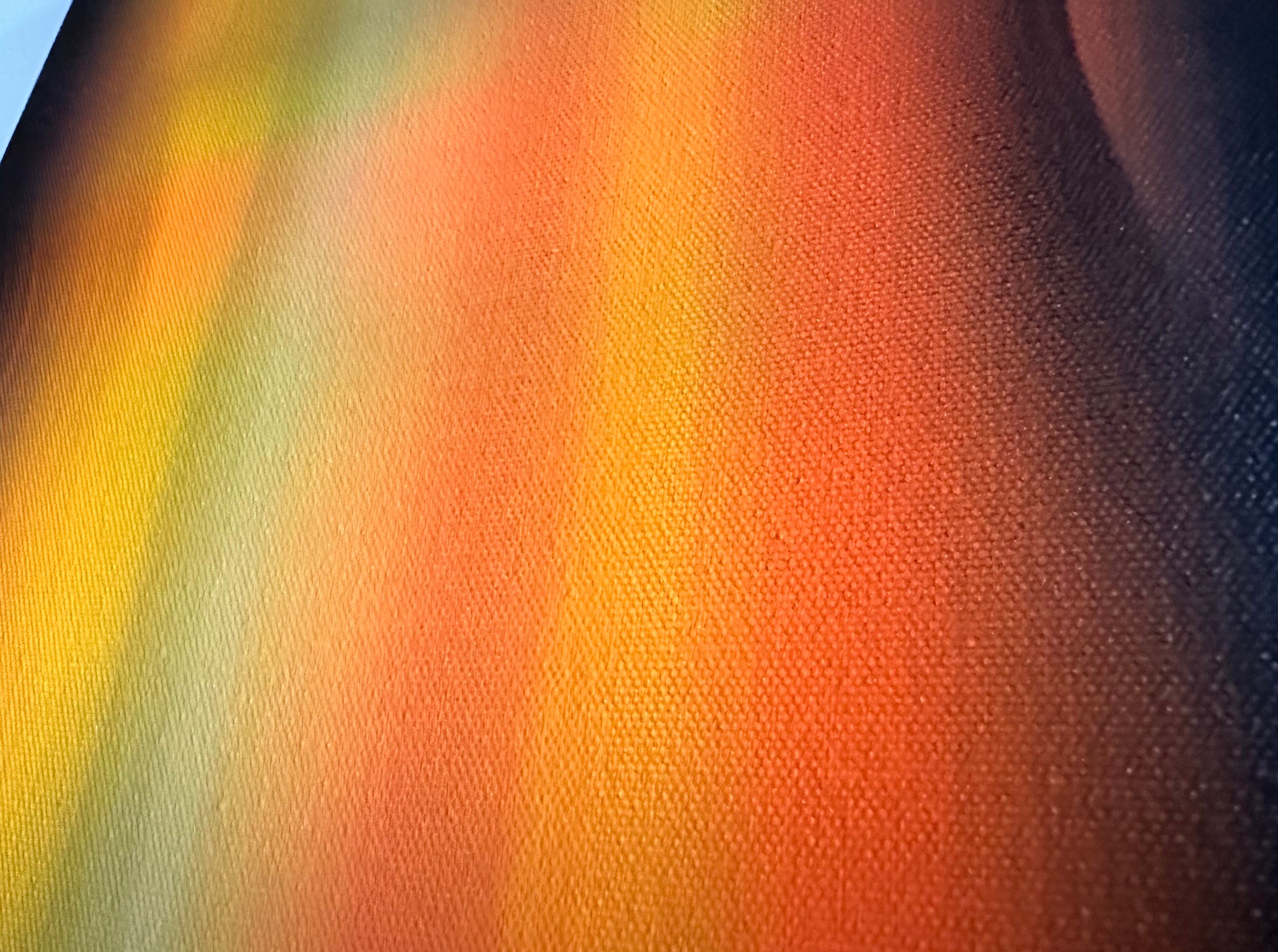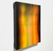本作は焚き火を見ると心が静かになる感覚を表現したくて暖色を重ねて描いた、ゆらぐ色彩のカラードローイングです。作品の正面に立つと、暗闇の中でゆらめくような、イエロー・オレンジ・レッドの重なりを感じていただけます。