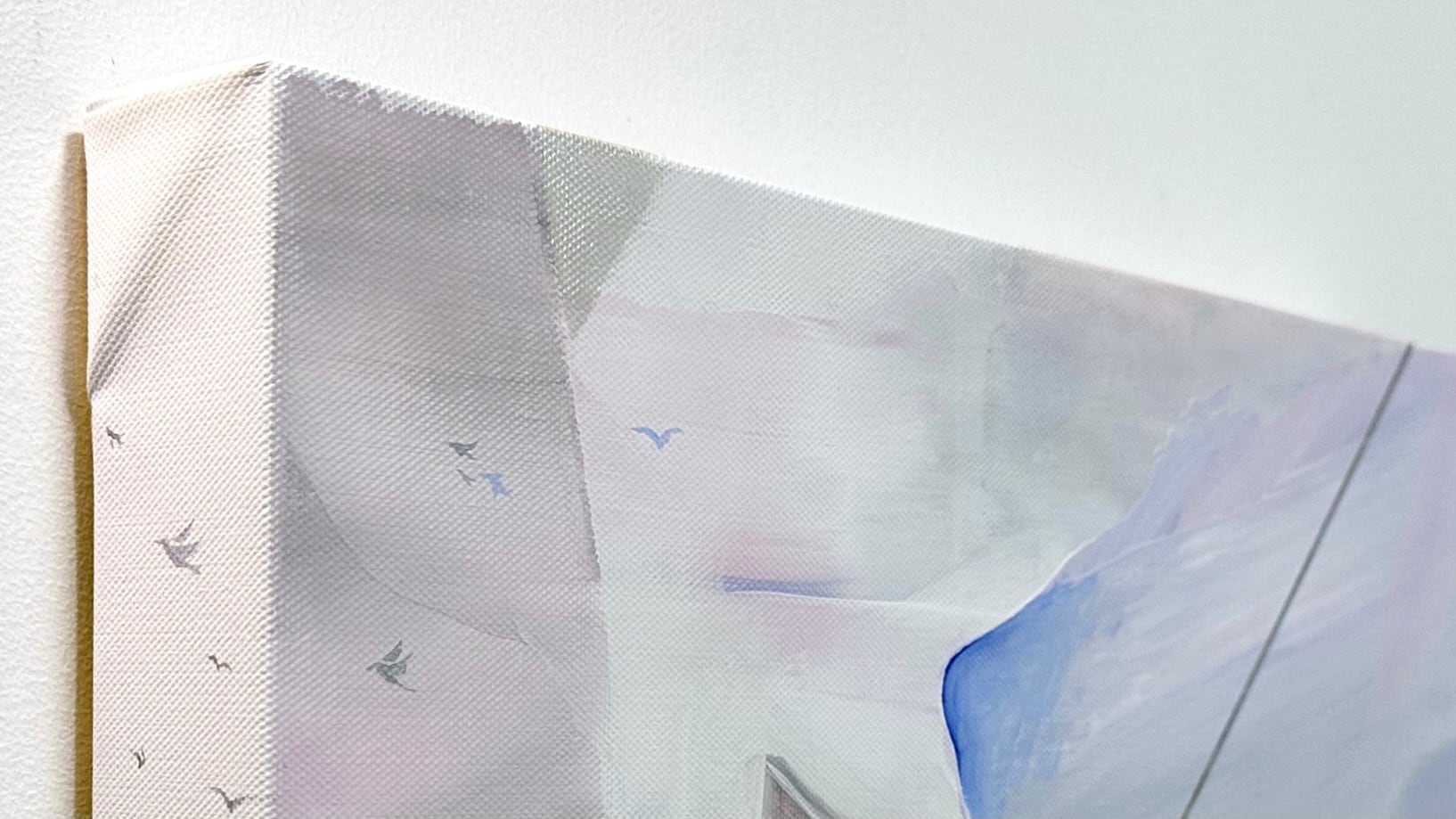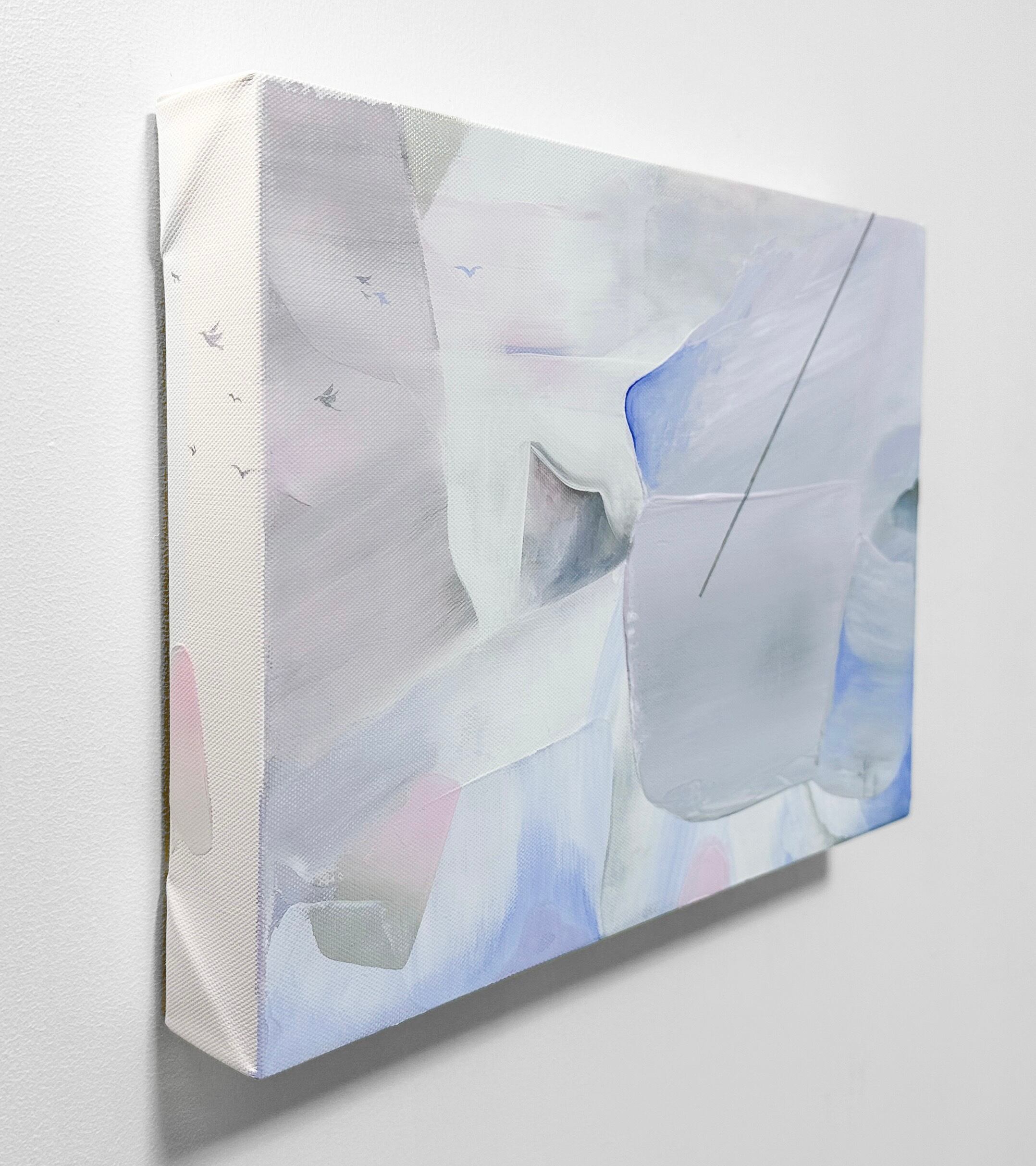 作品は、はじめにのせた白・青・桃色の3色の混ざり合いや絵具の盛り上がりから、想像が広がって、曲線や直線が引かれ、鳥が羽ばたく景色や、冬の雪原などの具体的なイメージが浮かび上がっていきました。