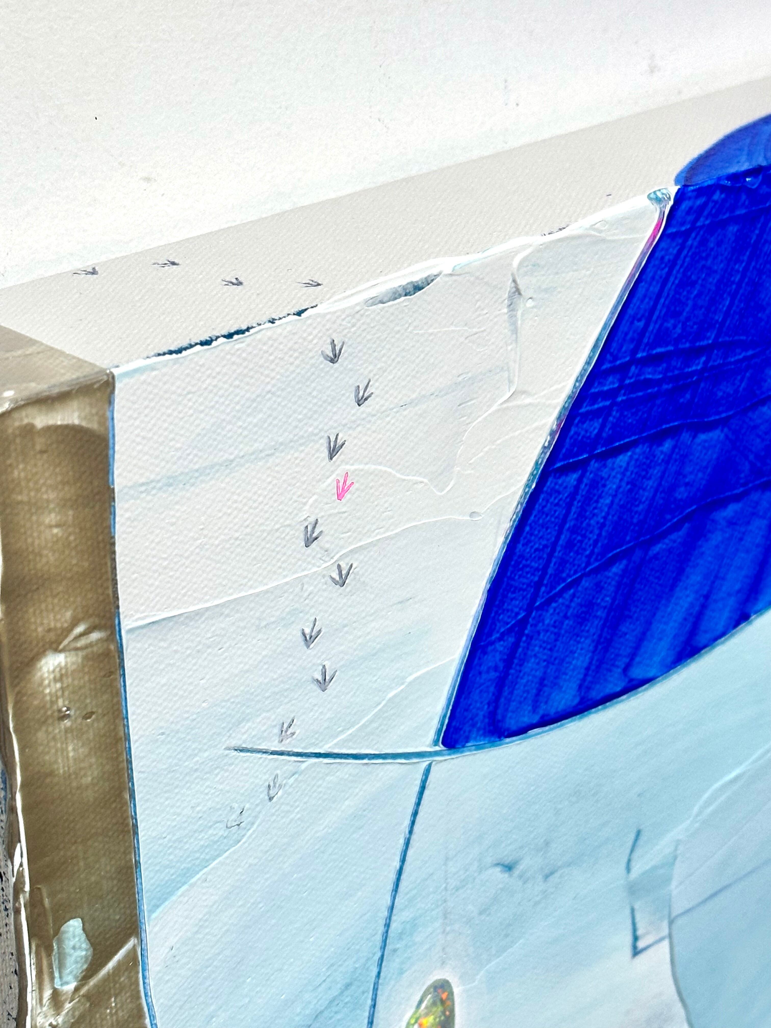 本作は、真っ白なキャンバスと向き合って、はじめに載せた絵具の色や凹凸からイメージを連想し、雪原で宝探しをするような気持ちで描いた、白と淡青の新作です