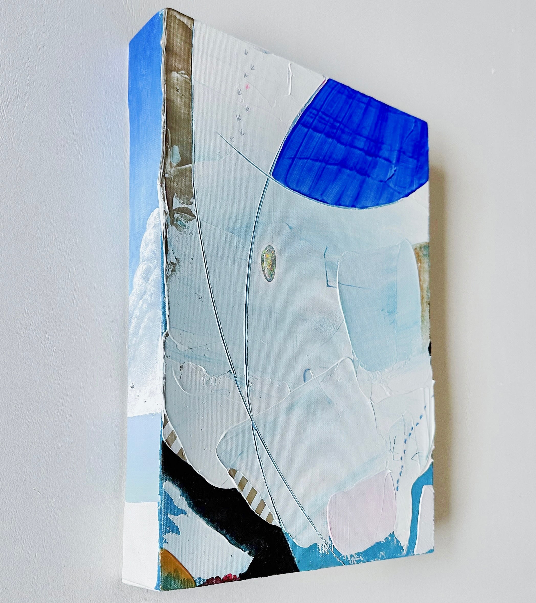 作品は、はじめにのせた青と白の重なりから新雪が降り積もる雪原のイメージが広がって、そこからシュプールのような曲線や、動物たちの足跡、遊色がきらめくオパールなど、具体的なイメージが浮かび上がっていきました。